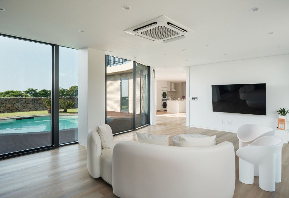 이이도 빌라의 하이라이트 중 하나는 바로 일정한 온도로 유지되는 따뜻한 온수풀입니다. 푸른 제주 하늘 아래에서 물결이 햇살에 반짝이는 모습을 보며 수영하는 경험은 잊을 수 없는 추억을 선사합니다.